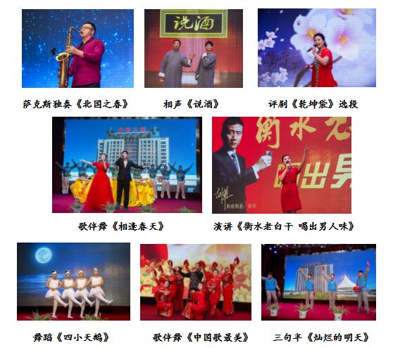 公司舞蹈隊帶來(lái)的舞蹈《酒道》,以逼真的表演將老白干酒文化呈現給觀(guān)眾,更把我們老白干精湛的釀酒技藝用肢體語(yǔ)言演繹的惟妙惟肖。詩(shī)朗誦《老白干禮贊》,高度贊揚了衡水老白干建廠(chǎng)七十周年,一代代老白干人一路走來(lái)披荊斬棘,繼承傳統、開(kāi)拓創(chuàng )新,譜寫(xiě)成老白干最響亮的贊歌。營(yíng)銷(xiāo)公司崔艷芳、劉康康帶來(lái)的小品《新白娘子傳奇》,搞笑滑稽的動(dòng)作,奪人眼球,令觀(guān)眾拍手叫好。包裝一車(chē)間袁文興、貢愛(ài)華帶來(lái)的相聲《包裝一車(chē)間新聞聯(lián)播》,以幽默的語(yǔ)言,夸張的表情,使現場(chǎng)氣氛異?;钴S。最后,技術(shù)中心皮寒玉帶來(lái)歌伴舞《相聚中華》,聯(lián)歡會(huì )在最強音的旋律中圓滿(mǎn)結束。